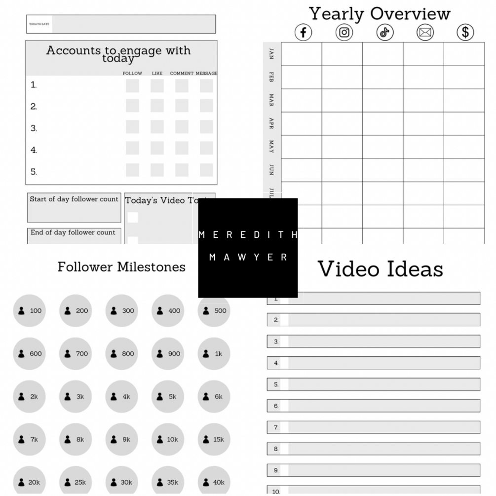 - Community Engagement: Use this page to list out 5 accounts you are going to interact with each day, keep track of your follower growth each day, and the videos you plan on posting.